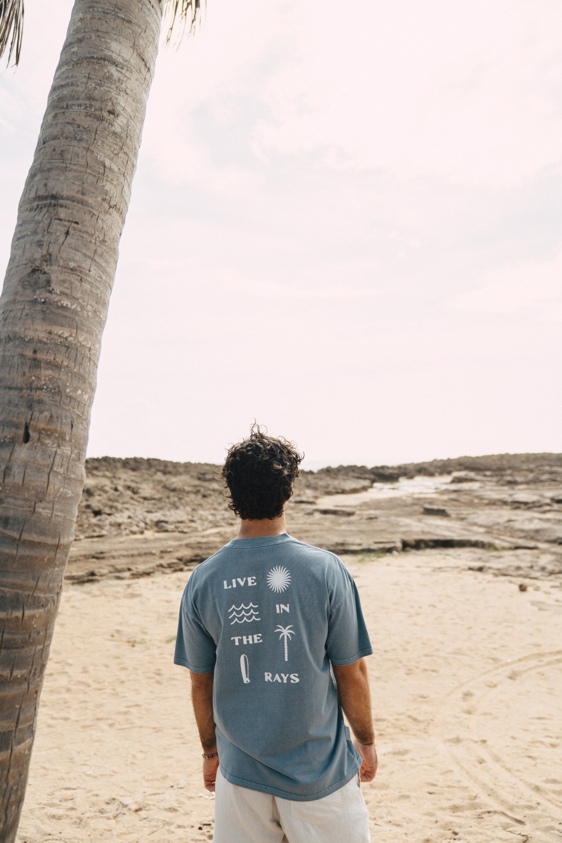 Embrace the tropical lifestyle with our Live in the Rays T-Shirt, crafted from organic cotton for a soft, breathable feel. The stone-washed ocean blue fabric offers a relaxed, lived-in look that captures the essence of sun-soaked days. Perfect for those who cherish warm rays and coastal vibes, this tee combines comfort with sustainable style for everyday wear.
