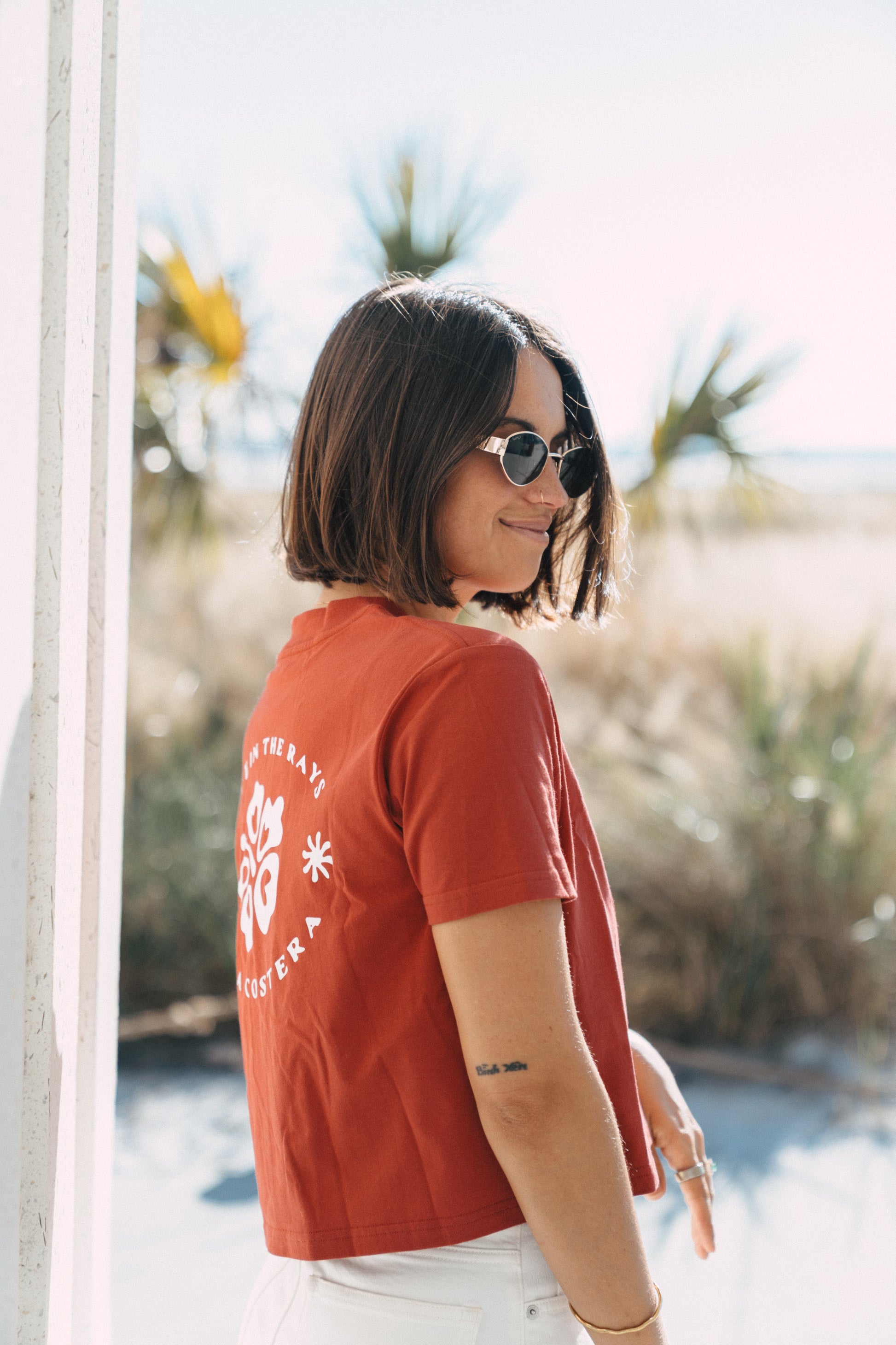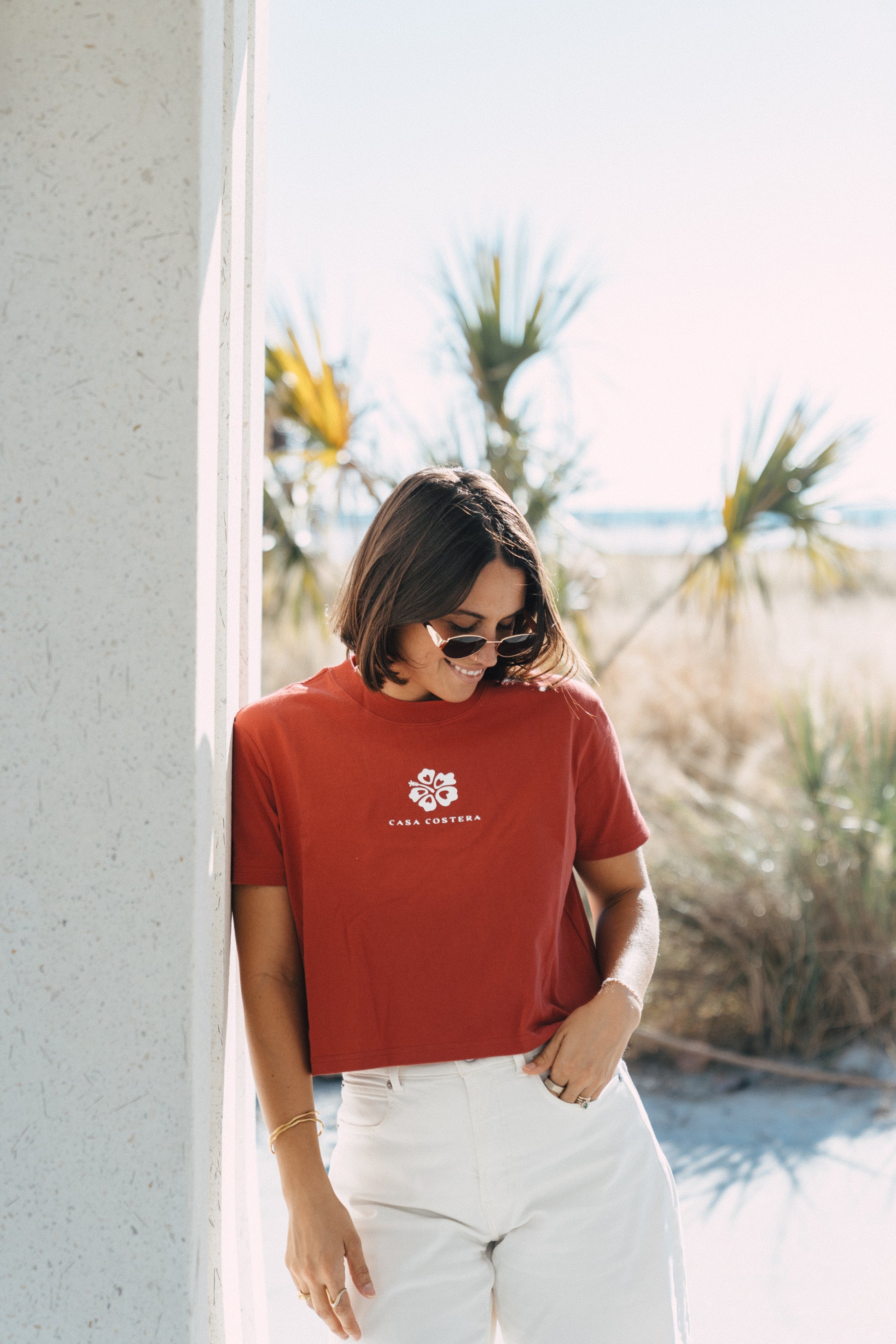 The Flora Crop celebrates the botanical richness of Puerto Rico through its striking deep red colorway and intricate floral design inspired by the Thespesia grandiflora. Crafted from 100% organic cotton, this piece combines cultural heritage with sustainable craftsmanship, offering exceptional breathability and comfort. The carefully rendered botanical motif adds visual depth while maintaining the relaxed elegance Casa Costera Co. is known for. An ideal choice for those seeking meaningful design paired with premium, eco-conscious materials.