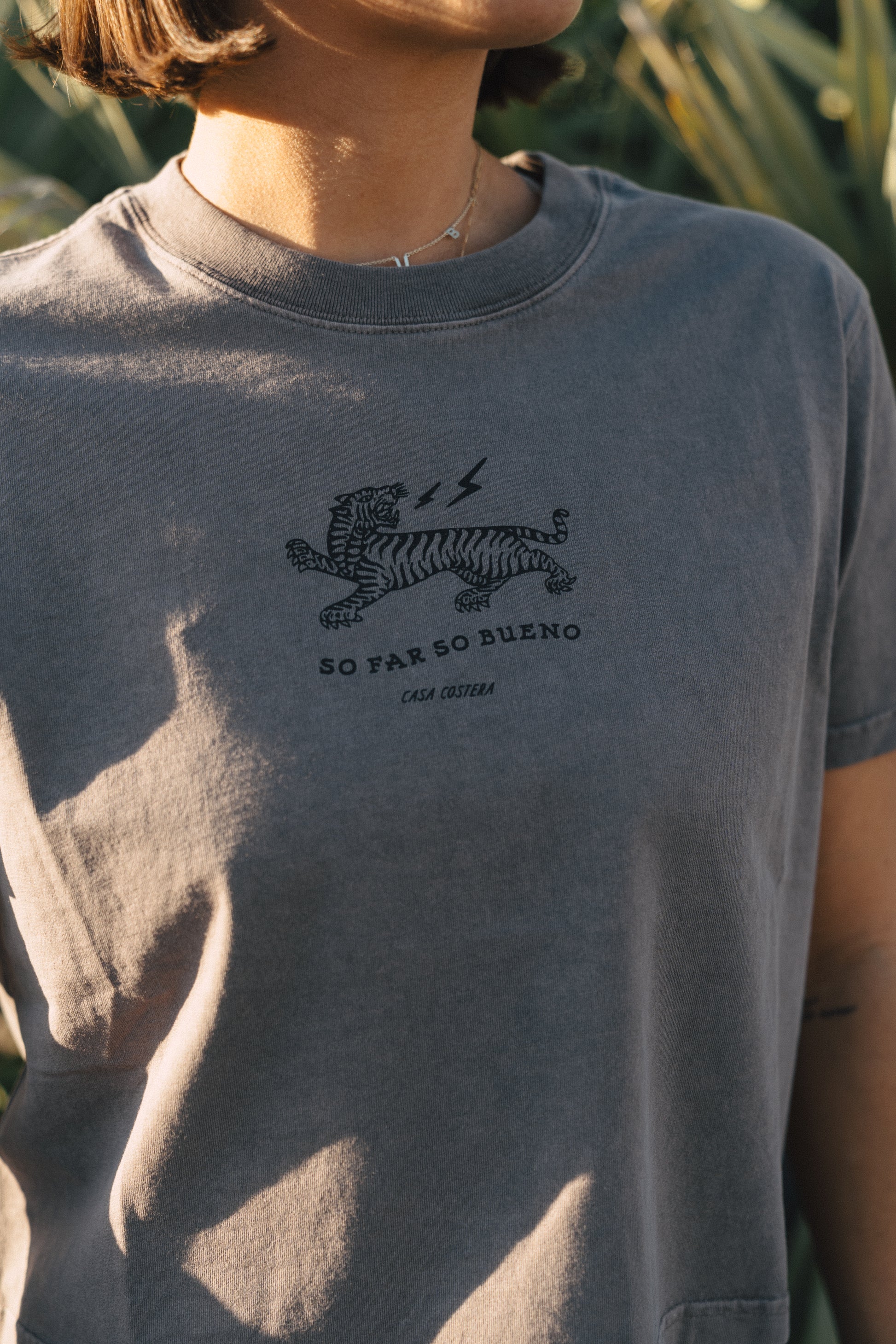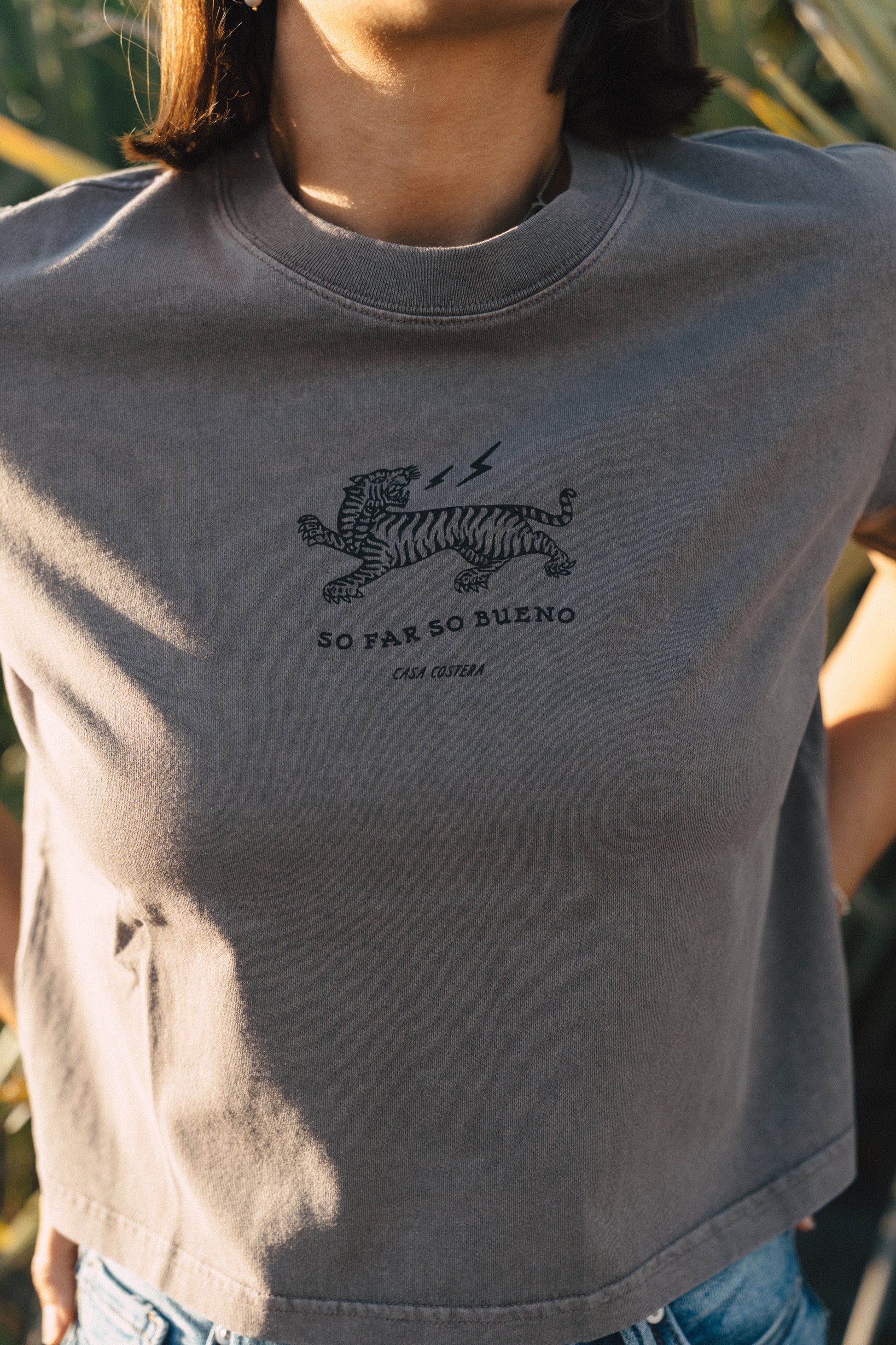 Crafted from 100% organic cotton, this cropped tee combines comfort with conscious style. The relaxed fit and stone-washed finish deliver an effortlessly cool aesthetic that works with any wardrobe. The "So Far So Bueno" slogan serves as a meaningful daily reminder to acknowledge progress, no matter how small, and embrace the continuous journey of self-improvement. Perfect for those who value both quality materials and intentional messaging.