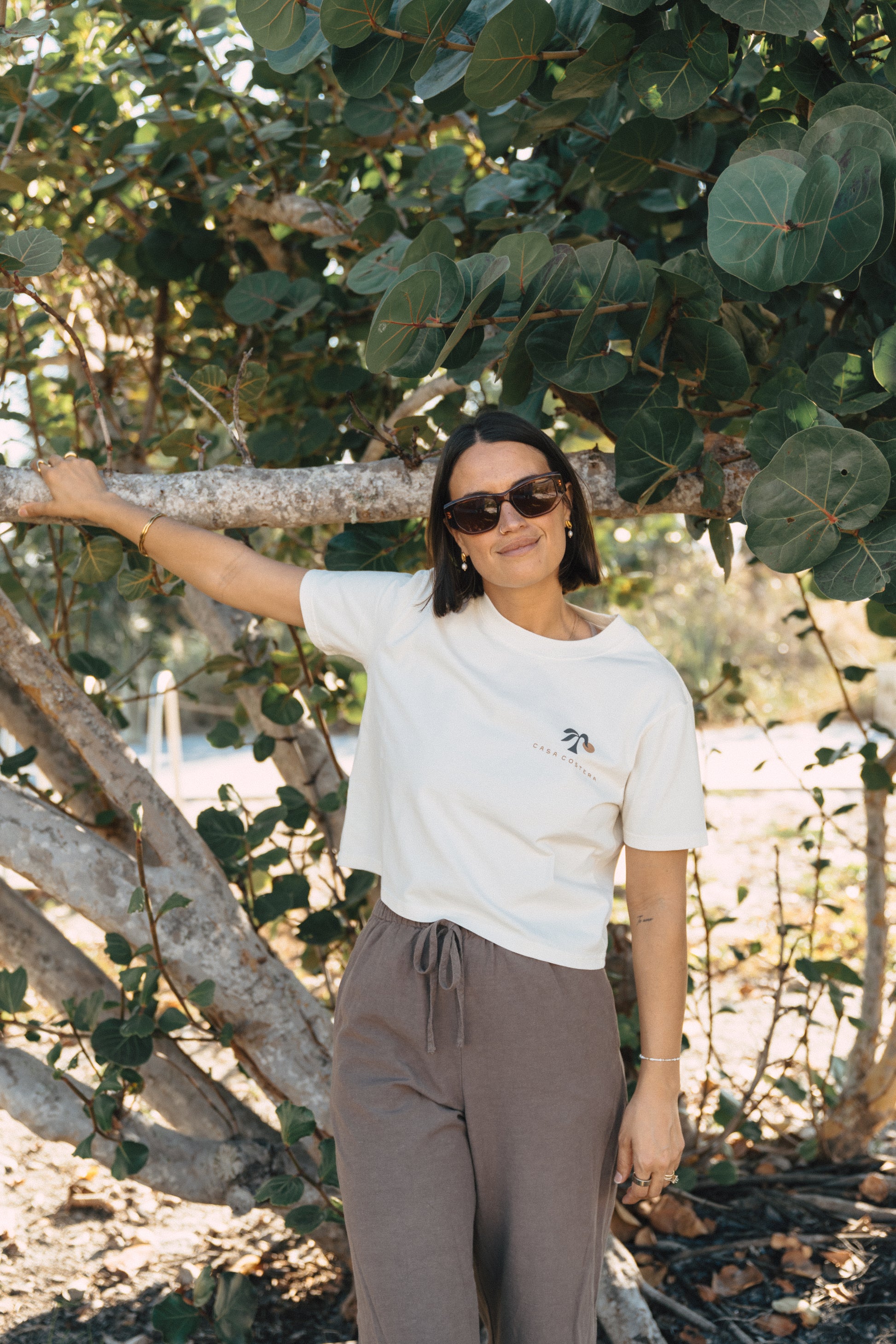 Crafted from organic cotton, this relaxed-fit crop captures the essence of coastal living, evoking golden-hour sunsets and the vibrant energy of beachside music venues. The soft, cloudy white fabric serves as a versatile canvas for layering or wearing solo, offering breathable comfort for warm-weather styling. Perfect for those who carry the carefree spirit of the Sunshine State wherever they go.